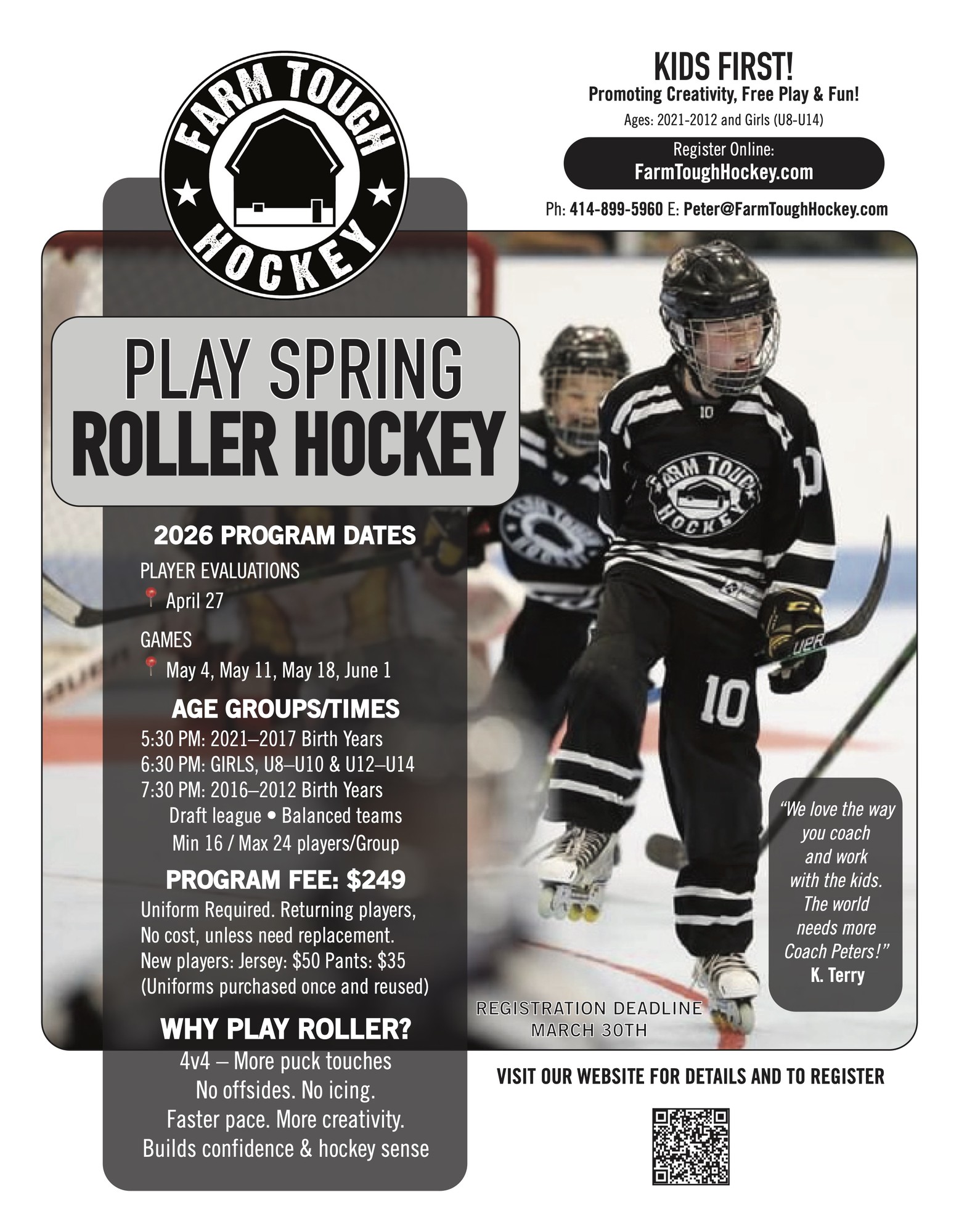 It is a five week program. We do an initial evaluation skate to confirm kids skill level. This helps insure parity for our draft games. We will have 4 weeks of Drat Games, all led by Peter Dale, 6x Roller Hockey World Champion and Founder of Farm Tough Hockey.